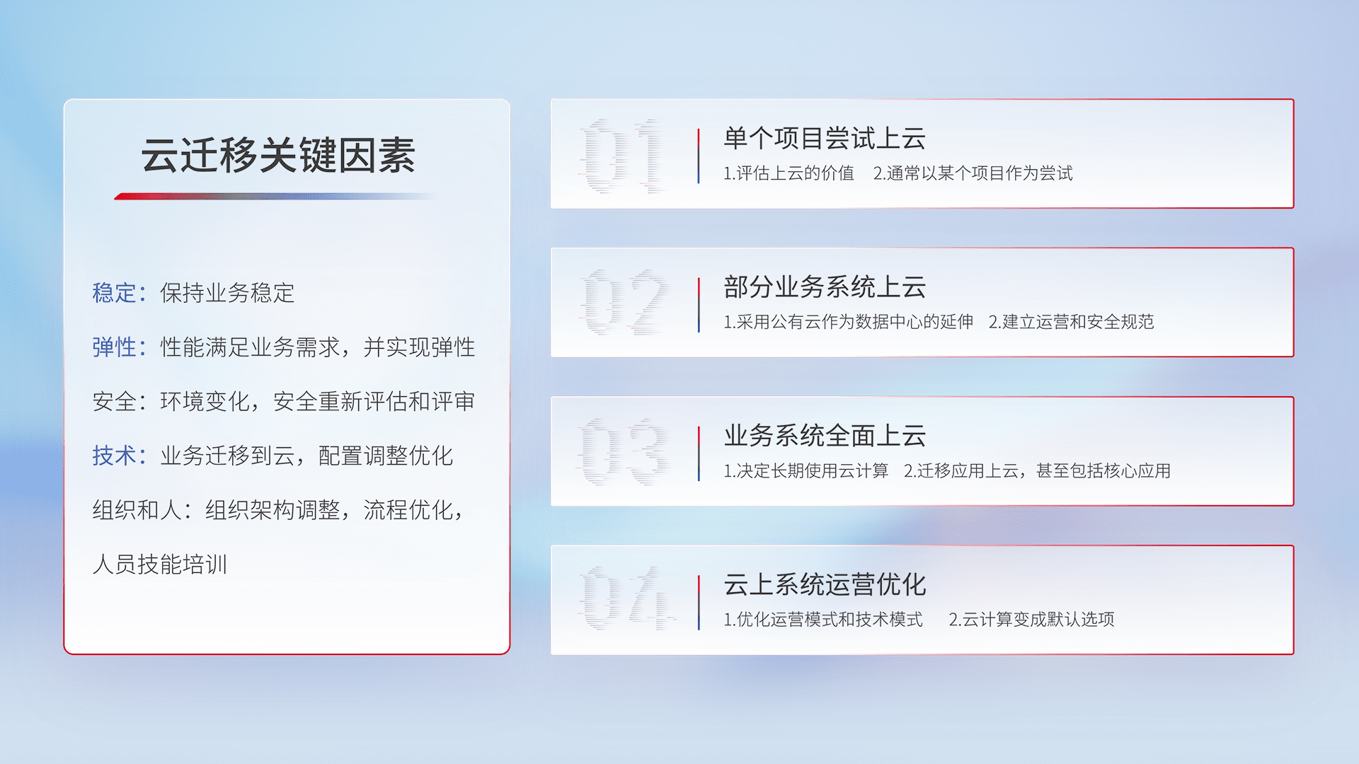 结合实际业务,,,从规划设计、、云平台选型、、、、云原生改造、、数据迁移、、、集成交付,,,,迁移全过程为客户识别最佳上云路径,,,,做好风险识别管理,,设计网络架构、、、身份权限、、安全审计合规、、、、操作审计、、、日志审计、、、监控告警策略、、、多站点容灾设计等,,,,对云上基础设施进行整体规划,,,,提升IT治理水平,,,以满足弹性、、、高可用、、高性能的需求。。。。