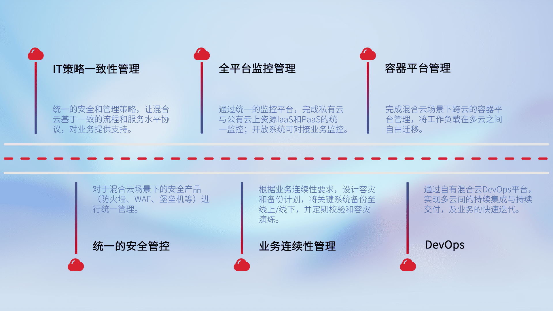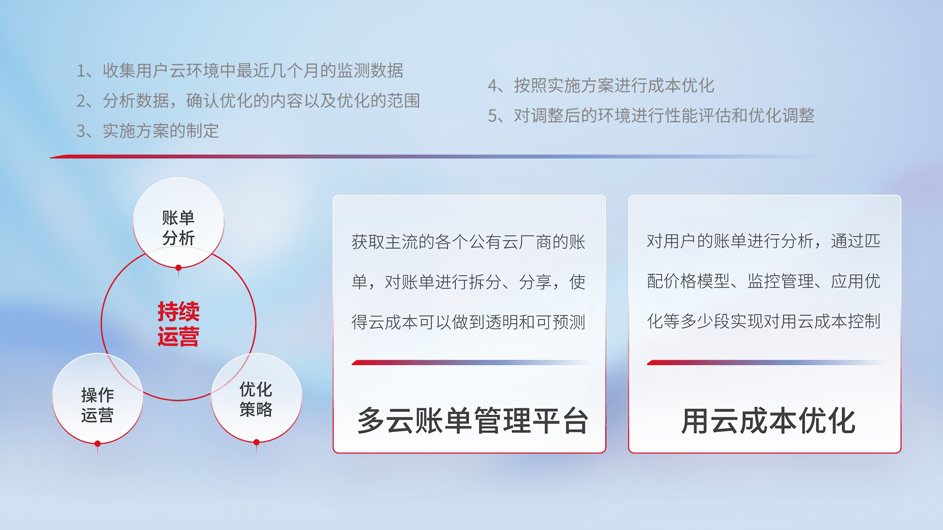 通过多云纳管,,,以统一的资源数据模型把客户的云资源进行抽象和封装,,进而实现对多云资源的统一操作,,,,保障云资源管理的可靠性、、、稳定性与可用性。。。量身定制化运维内容,,配置、、开发运维、、、、补丁管理、、、备份、、监控、、、认证和访问管理、、审计和日常巡检等,,,保障在用云过程中的可靠度,,,,稳定度以及高可用率。。