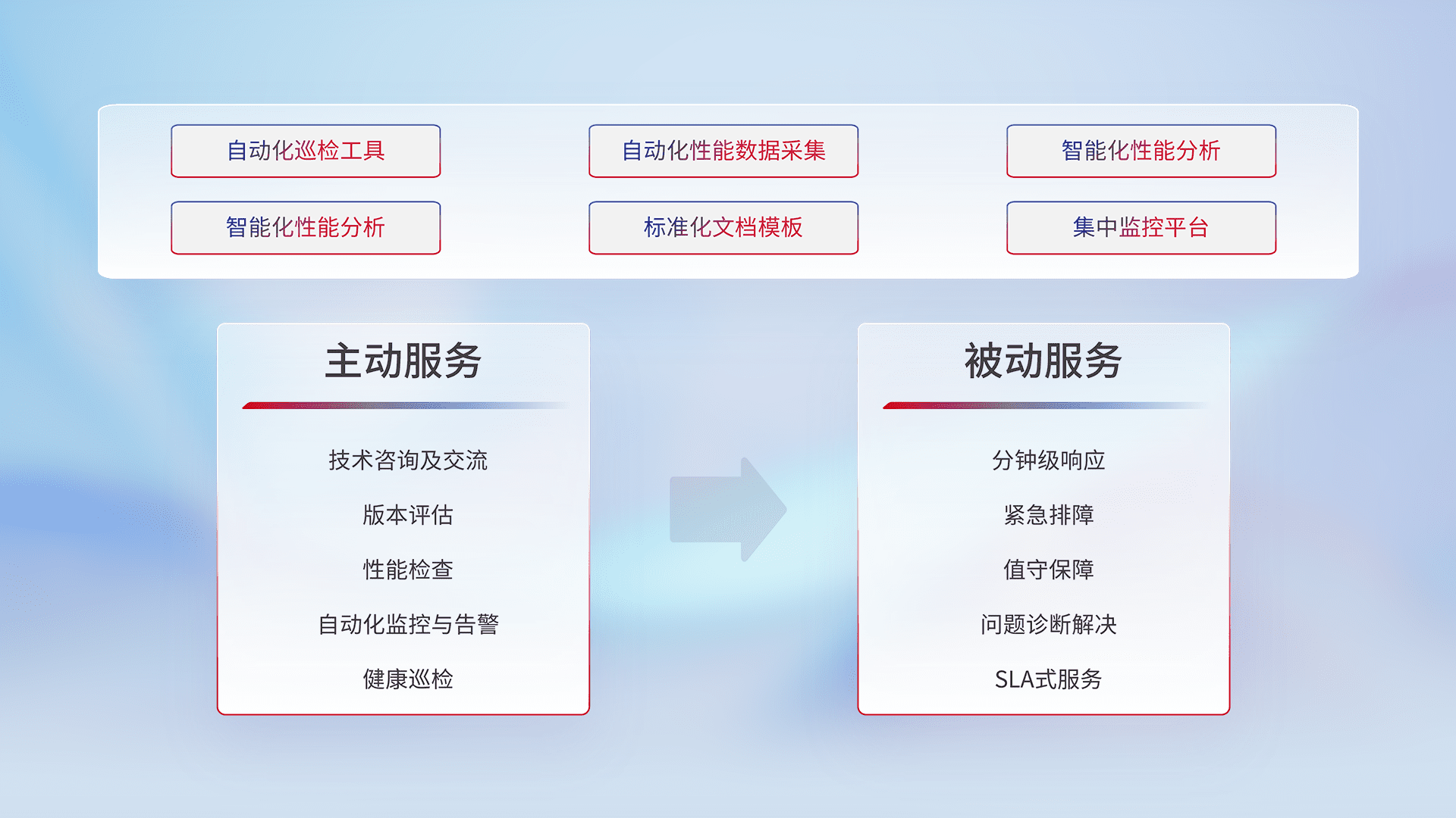 智能化工具和标准化文档,,,保障服务质量,,提供主动服务(包含技术咨询、、版本评估、、、性能检查、、、、自动化监控与告警、、、健康巡检)和被动服务包含(分钟级响应、、、、紧急排障、、、、值守保障、、、、问题诊断解决、、、SLA服务)。。。