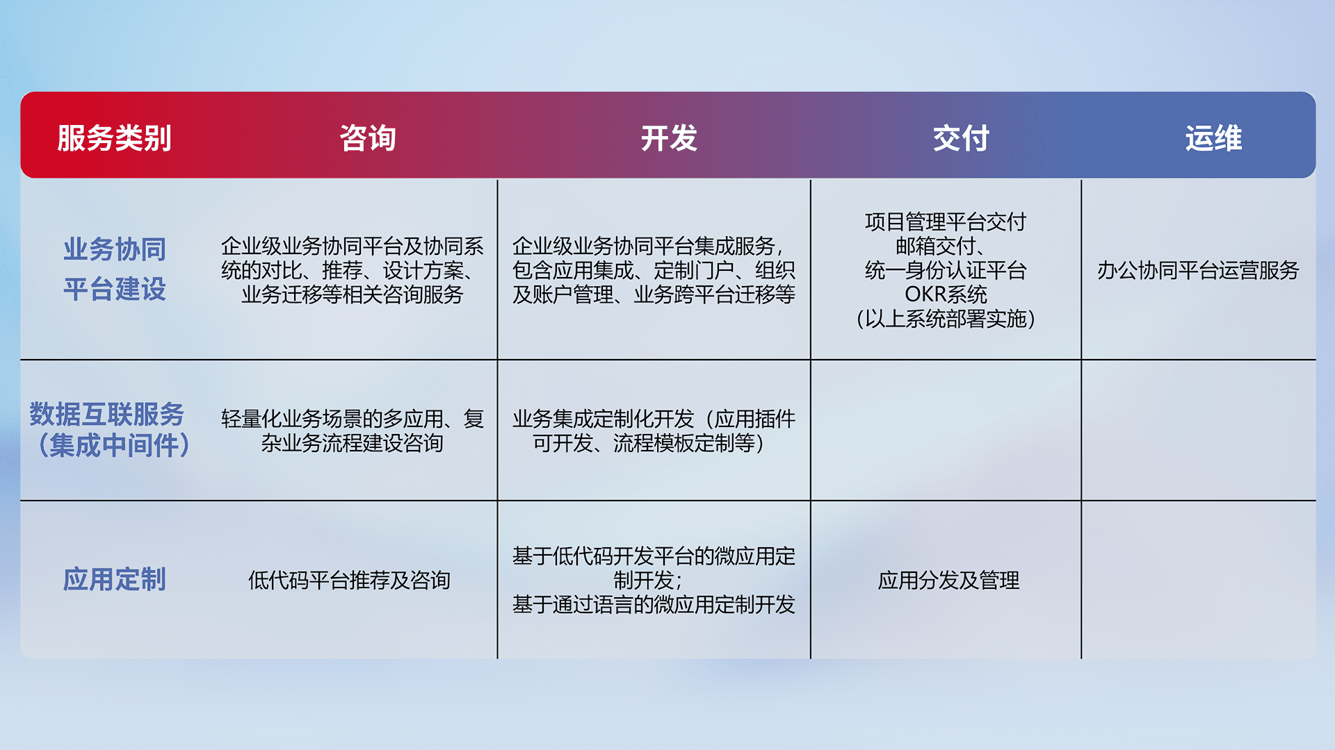 针对钉钉、、、、企微、、IDaas等平台级产品提供产品的规划、、、方案、、、交付、、定制化开发等服务,,实现如统一协同办公、、、、智能客户服务、、混合会议管理、、、智能数据查询、、、、等业务场景,,实现数字化转型。。。。